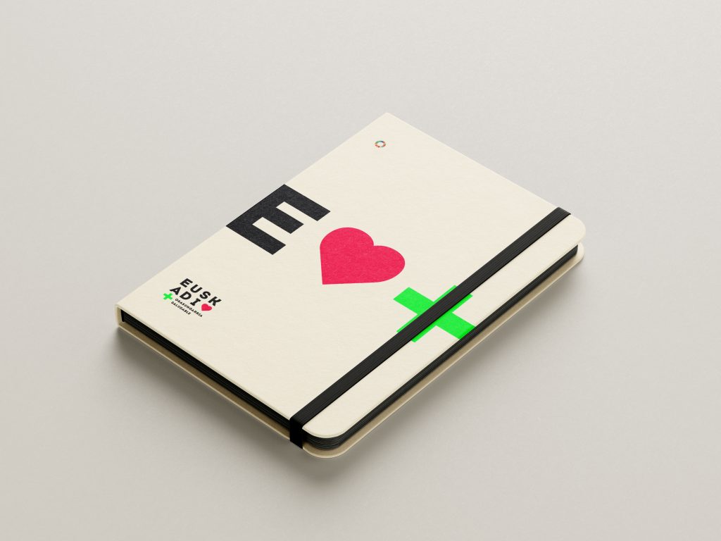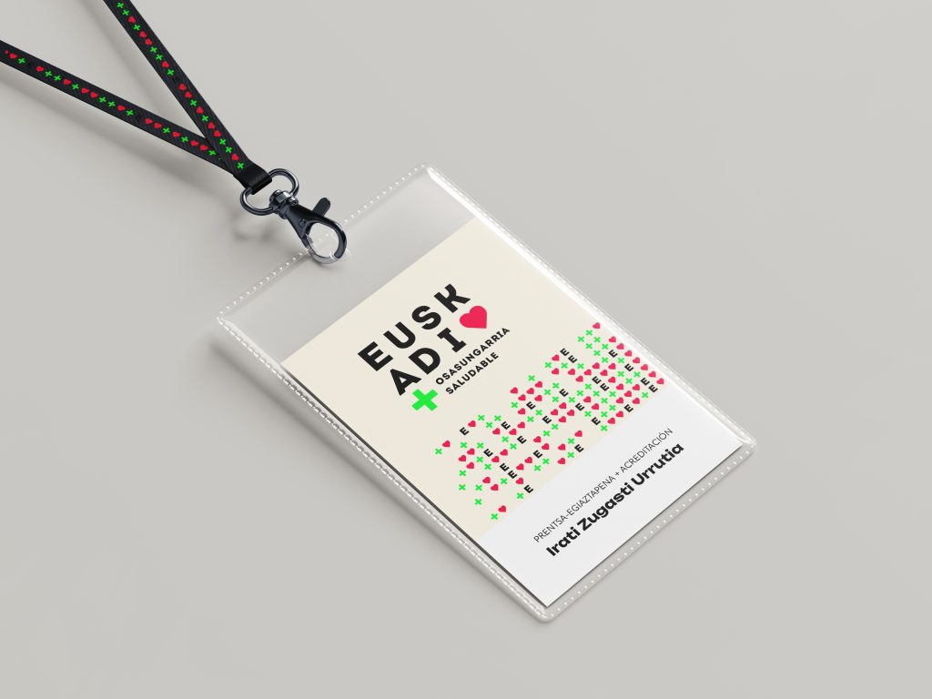 A partir de símbolos universales asociados a la salud —el corazón y la cruz médica— se articuló el nombre del plan en un bloque visual coherente en euskera y castellano, garantizando legibilidad, equilibrio y pregnancia en ambos idiomas. Los colores parten de un elemento profundamente arraigado en la identidad vasca: la ikurriña. Los colores fueron actualizados para priorizar un uso digital más versátil, fresco y saturado.